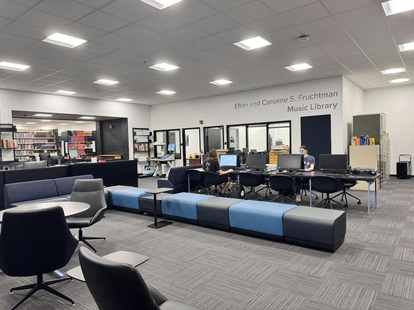 The music library consists of two rooms, the main room has several computers and sitting areas for students to hang out, read, and talk. The second room is where the stacks are housed- a more quiet area with spaces for students to study and sit.