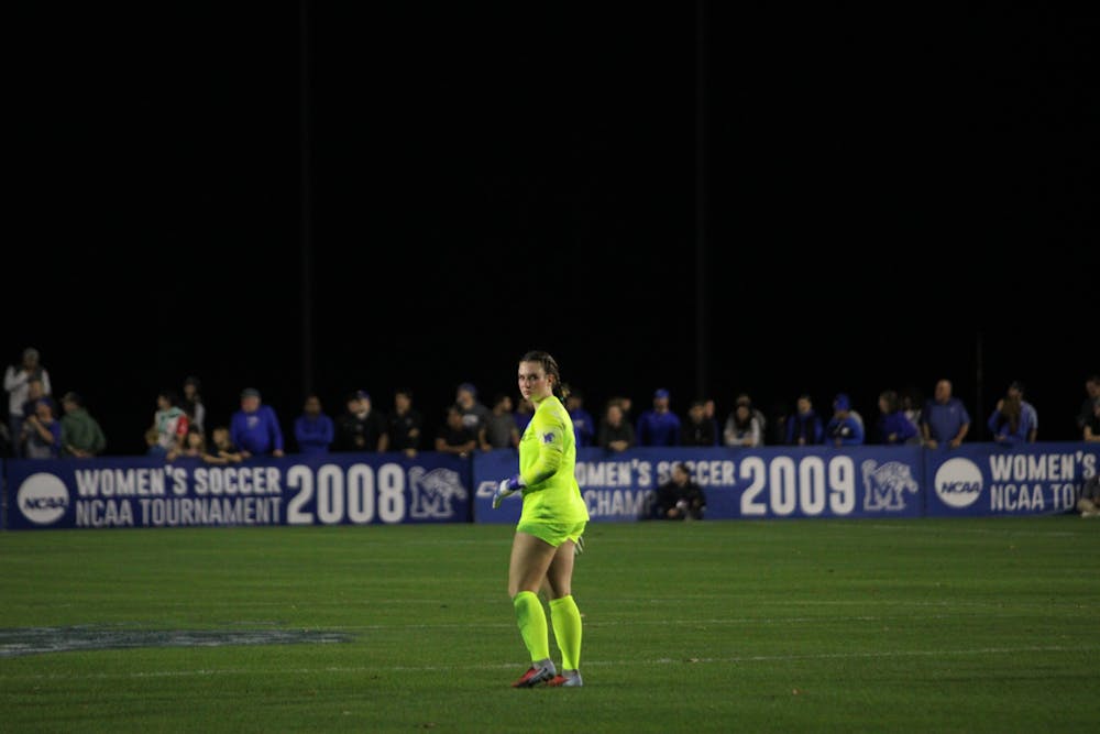 Memphis goalkeeper Abby Kudla looks back at her goal in the second half of the Tigers' 2-1 win over Illinois Saturday night at the Park Avenue Campus in the first round of the NCAA tournament.