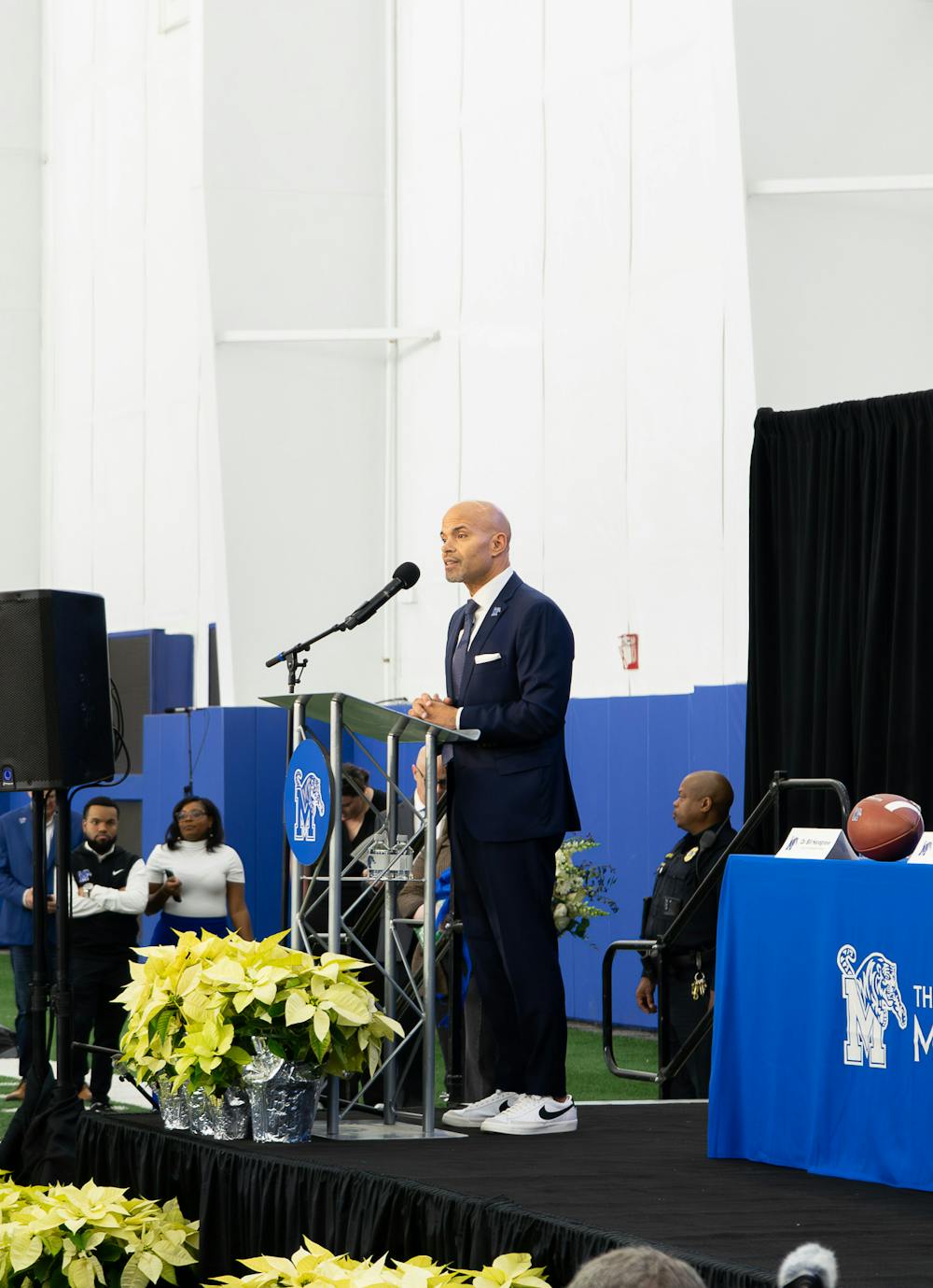 University of Memphis Athletic Director Ed Scott speaks on his hiring of Charles Huff at Huff's introductory press conference Wednesday at the Billy J. Murphy Athletic Complex.