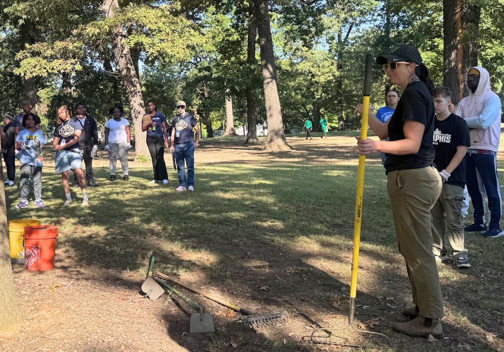 Emilie Bowman sits amongst members of the United Campus Workers while holding up a handmade sign given by one of the members