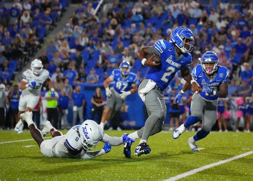 Memphis quarterback Brendon Lewis scrambles past a Tulsa defender in the Tigers' 45-7 victory over Tulsa earlier this month at Simmons Bank Liberty Stadium. Lewis' status against USF is unknown, as he left the UAB game early last week.