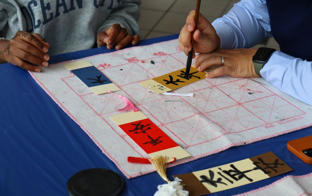 Students have their names written in calligraphy on bookmarks.
